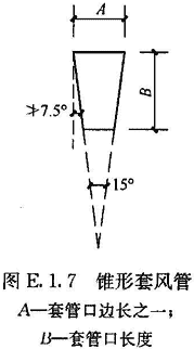 E.1.7 選用套管法時(shí),可用輕質(zhì)板材或膜材做成與風(fēng)口內(nèi)截面相同或相近、長(zhǎng)度大于2倍風(fēng)口邊長(zhǎng)的直管段作為輔助風(fēng)管,連接于過(guò)濾器風(fēng)口外部,在套管出口平面上,均勻劃分小方格,方格邊長(zhǎng)不大于200mm,在方格中心設(shè)測(cè)點(diǎn)。對(duì)于小風(fēng)口,最少測(cè)點(diǎn)數(shù)不少于6點(diǎn)。也可采用錐形套管,上口與風(fēng)口內(nèi)截面相同或相近,下口面積不小于上口面積的一半,長(zhǎng)度宜大于1.5倍風(fēng)口邊長(zhǎng),側(cè)壁與垂直面的傾斜角不宜大于7.5°,以測(cè)定截面平均風(fēng)速,乘以測(cè)定截面凈面積算出風(fēng)量(圖E.1.7)。