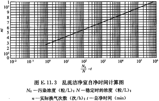 E.11.3 由測(cè)得的開機(jī)前原始濃度或發(fā)煙停止后1min的污染濃度(N0)、室內(nèi)達(dá)到穩(wěn)定時(shí)的濃度(N)和實(shí)際換氣次數(shù)(n)查圖E.11.3,得到計(jì)算自凈時(shí)間,再和實(shí)測(cè)自凈時(shí)間進(jìn)行對(duì)比。