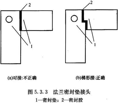 5.3.3 法蘭密封墊宜減少接頭,接頭應(yīng)采用階梯形或企口形并避開螺栓孔(圖5.3.3),也可采用連續(xù)灌膠成型或沖壓一體成型的密封墊。