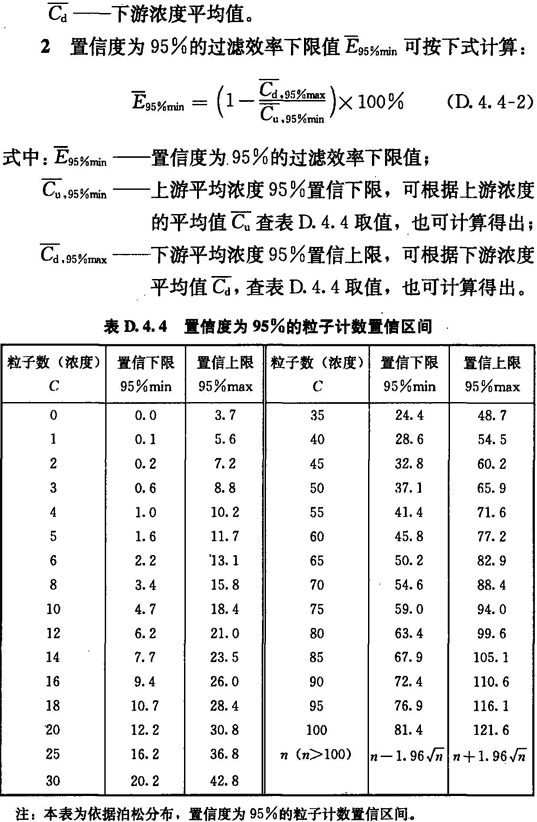 1 首先應(yīng)測試過濾器上游氣溶膠濃度Cu,并應(yīng)根據(jù)表D.4.4計算上游95%置信下限的粒子濃度Cu,95%min。
